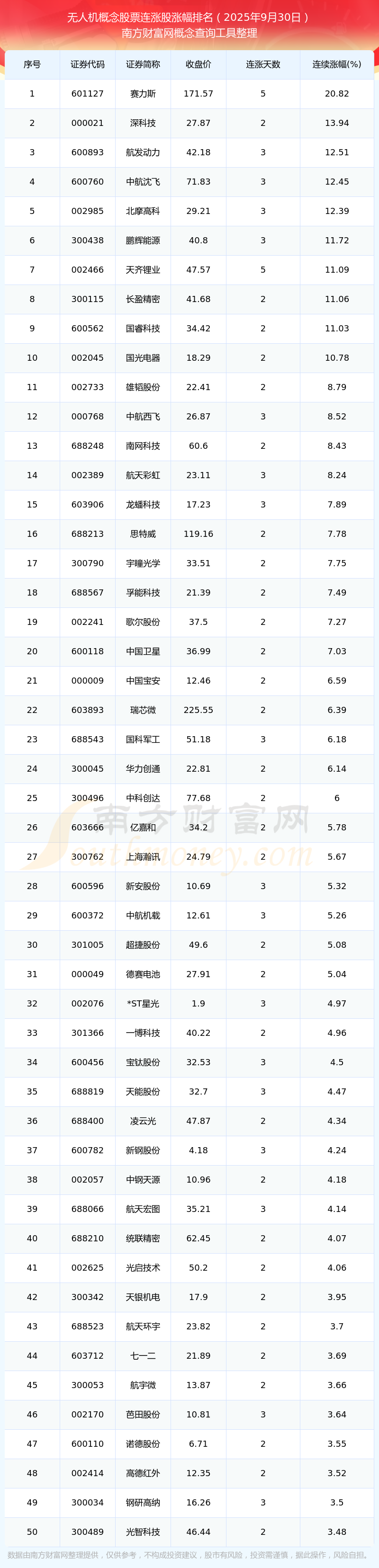 2025年9月30日無(wú)人機(jī)概念股票連漲股漲幅排名