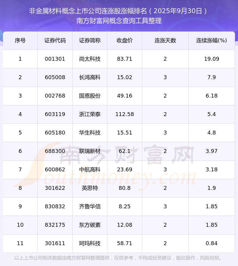 2025年9月30日非金屬材料概念上市公司連漲股漲幅排名