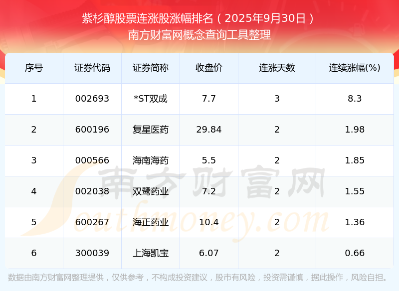 2025年9月30日紫杉醇股票連漲股漲幅排名