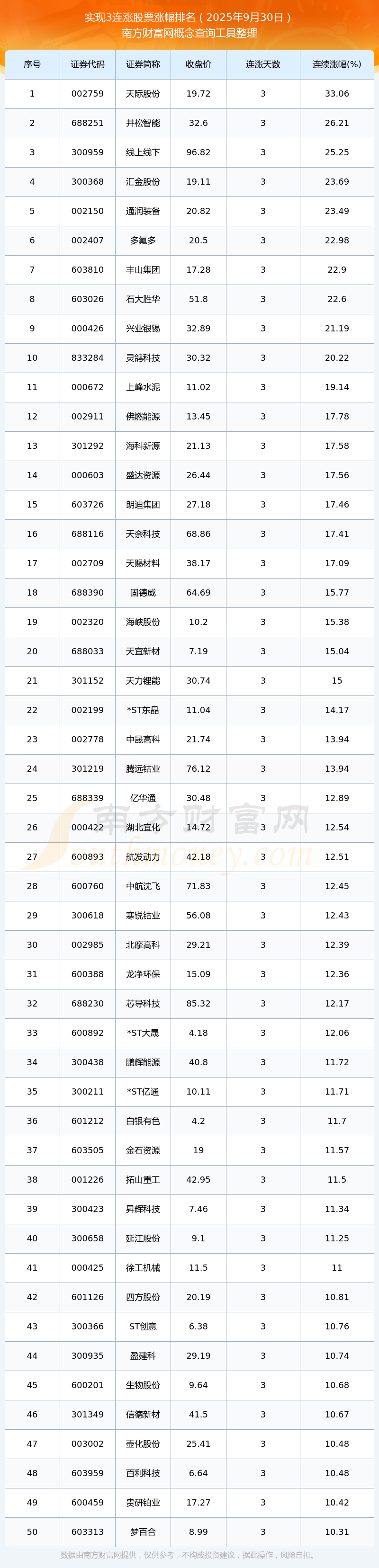 2025年9月30日實(shí)現(xiàn)3連漲股票漲幅排名