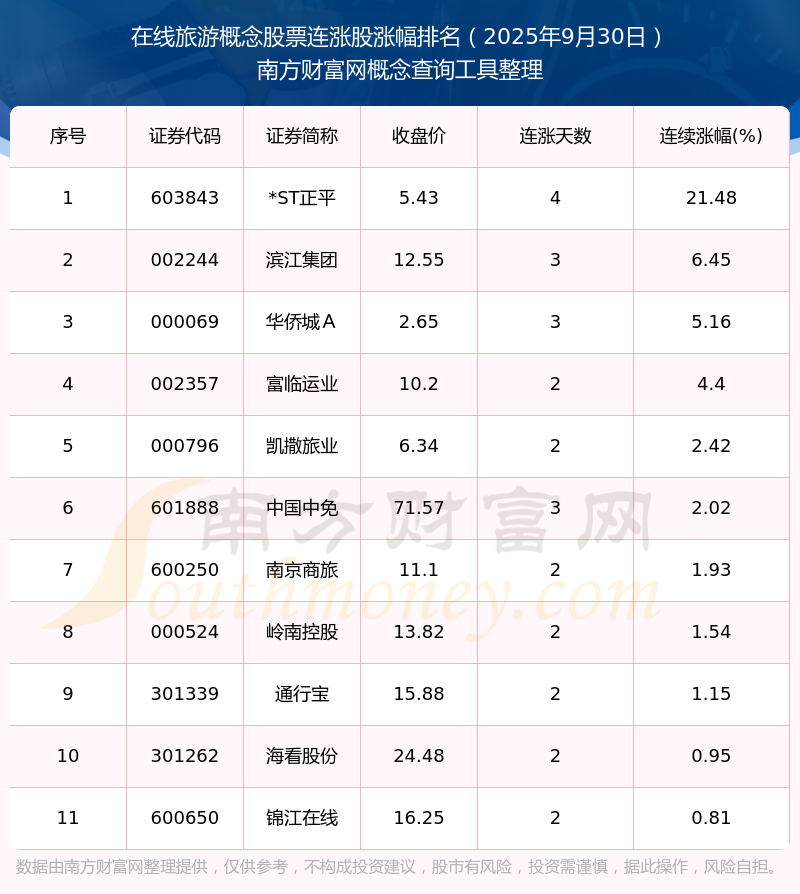 2025年9月30日在線旅游概念股票連漲股漲幅排名