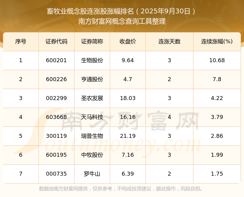 2025年9月30日畜牧業(yè)概念股連漲股票漲幅排名