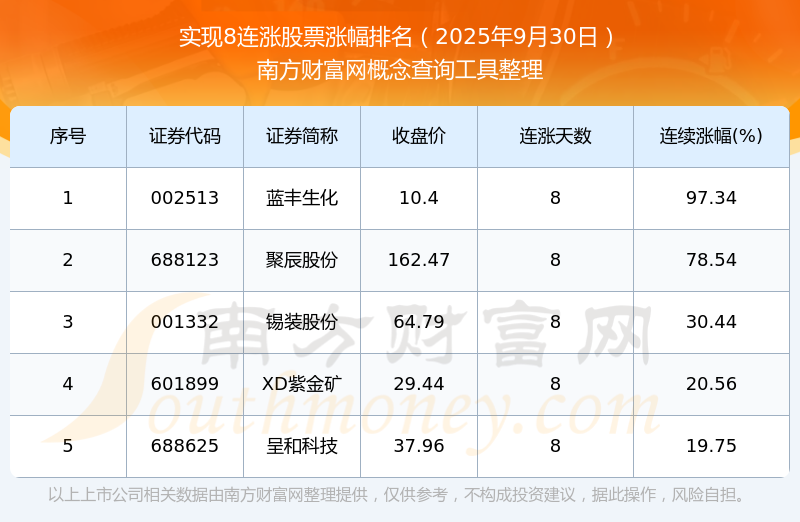 2025年9月30日實現(xiàn)8連漲股票漲幅排名