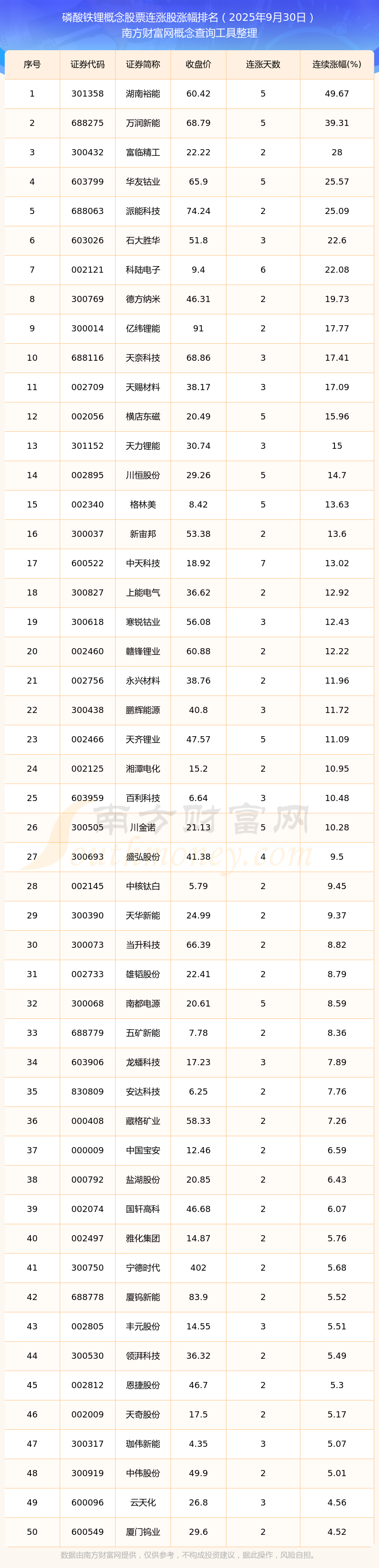 2025年9月30日磷酸鐵鋰概念股票連漲股漲幅排名