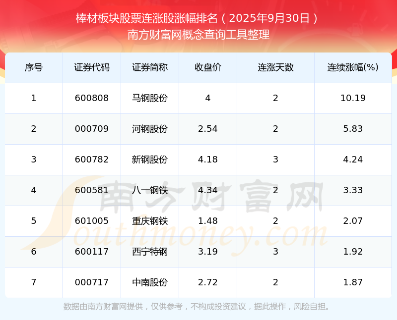 2025年9月30日棒材板塊股票連漲股漲幅排名