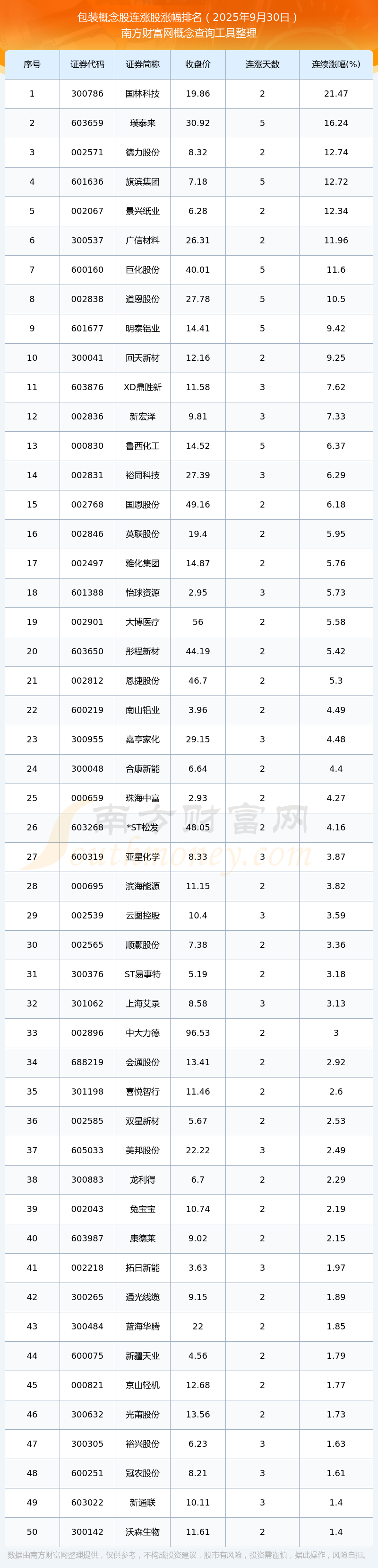 2025年9月30日包裝概念股連漲股漲幅排名