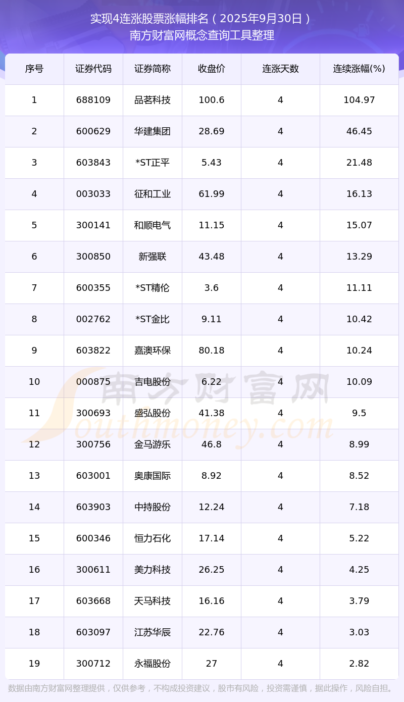 2025年9月30日實現(xiàn)4連漲股票漲幅排名