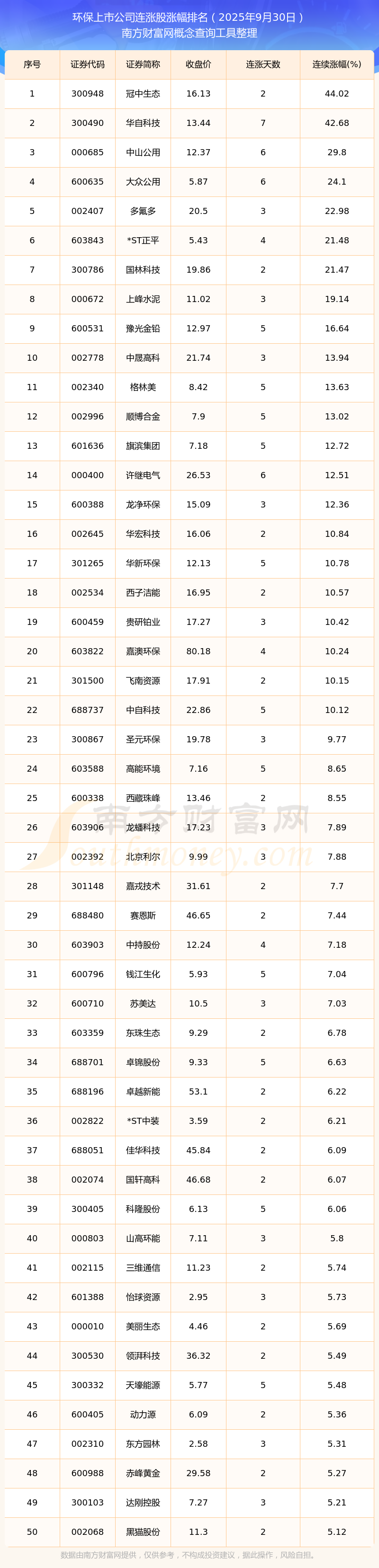 2025年9月30日環(huán)保上市公司連漲股漲幅排名