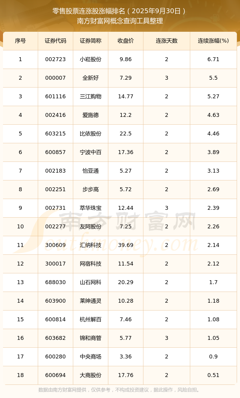 根據(jù)南方財(cái)富網(wǎng)概念查詢工具數(shù)據(jù)統(tǒng)計(jì),截止2025年9月30日收盤(pán),零售股票共有18只個(gè)股實(shí)現(xiàn)連漲。其中連續(xù)漲幅較大的個(gè)股有小崧股份、全新好、三江購(gòu)物等,連續(xù)漲幅分別為6.71%、5.50%、5.27%。
