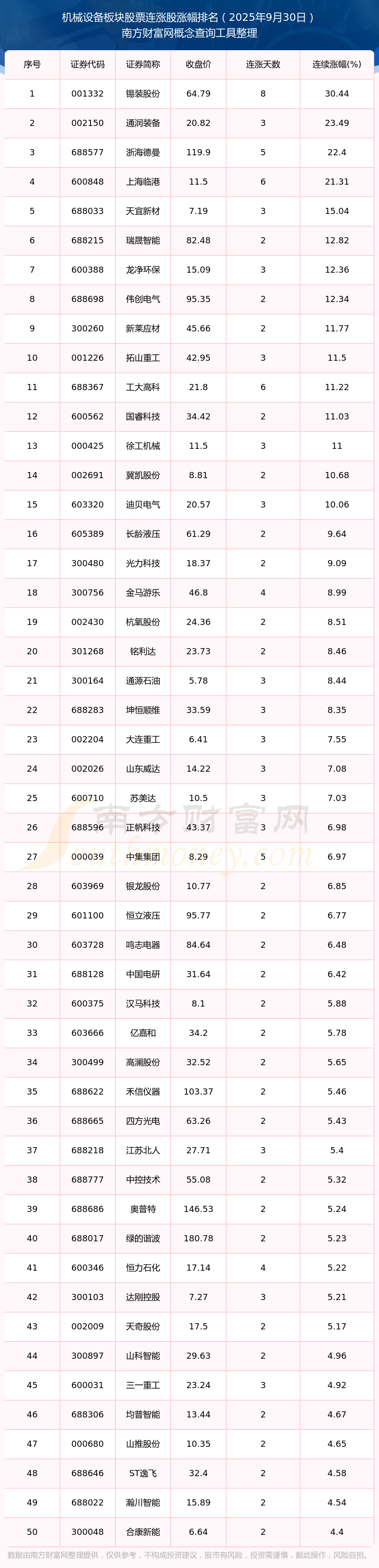 2025年9月30日機械設備板塊股票連漲股漲幅排名