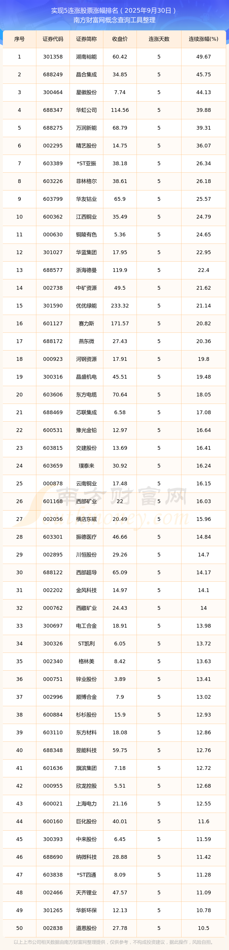 2025年9月30日連漲5天的股票漲幅排名