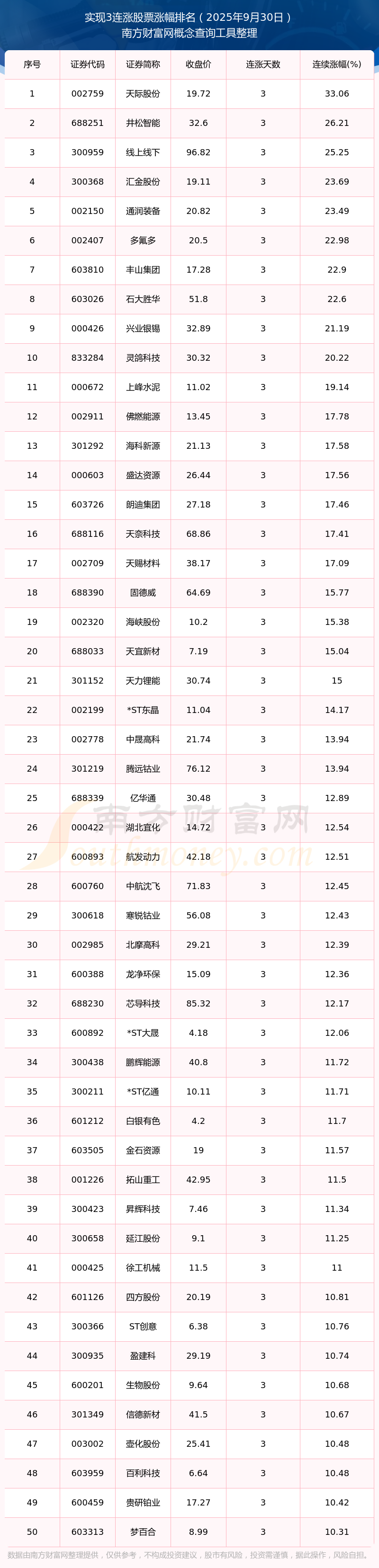 2025年9月30日實(shí)現(xiàn)3連漲股票漲幅排名