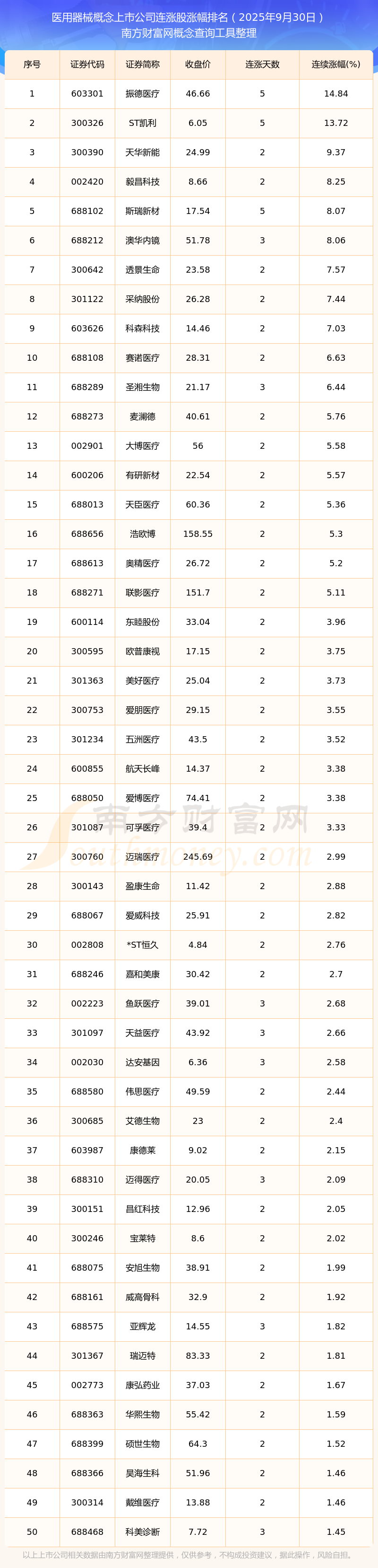 2025年9月30日醫(yī)用器械概念上市公司連漲股漲幅排名