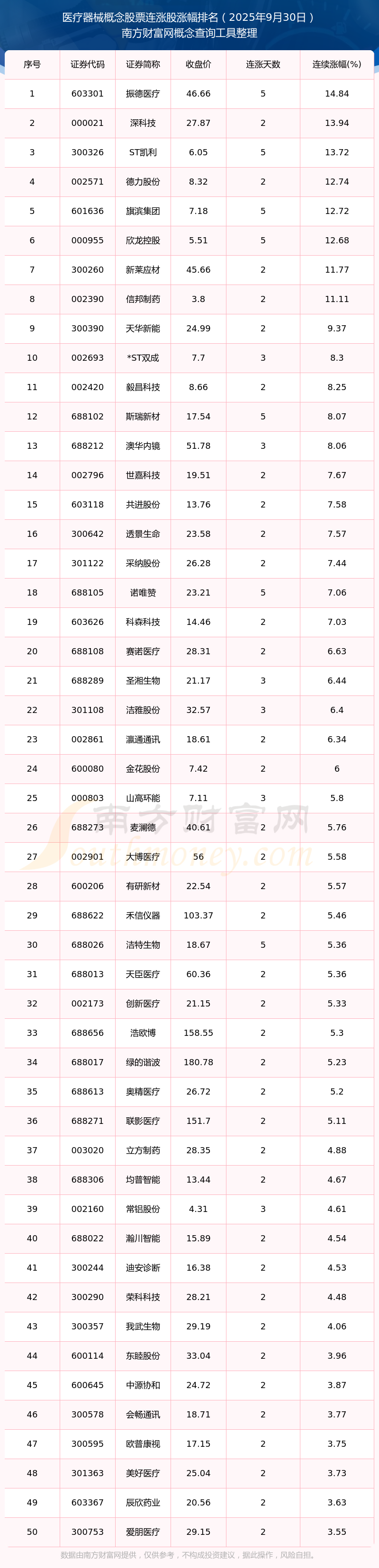 2025年9月30日醫(yī)療器械概念股票連漲股漲幅排名