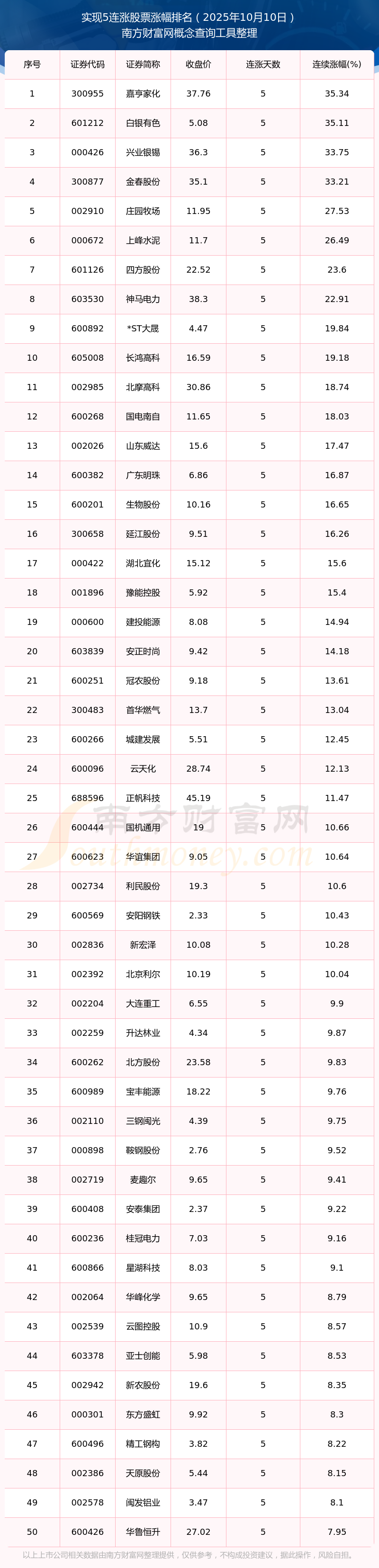 2025年10月10日實(shí)現(xiàn)5連漲股票漲幅排名