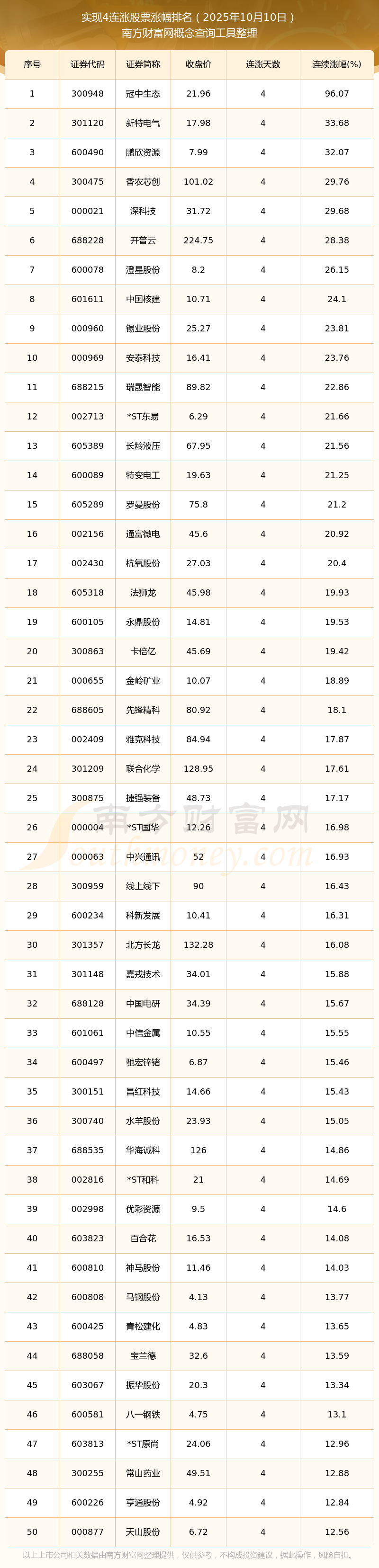 2025年10月10日實(shí)現(xiàn)4連漲股票漲幅排名