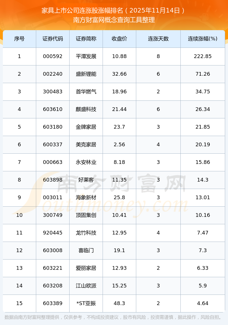 根據(jù)南方財(cái)富網(wǎng)概念查詢工具數(shù)據(jù)統(tǒng)計(jì),截止2025年11月14日收盤,家具上市公司共有15只個(gè)股實(shí)現(xiàn)連漲。其中連續(xù)漲幅較大的個(gè)股有平潭發(fā)展、盛新鋰能、首華燃?xì)獾,連續(xù)漲幅分別為222.85%、71.26%、34.75%。