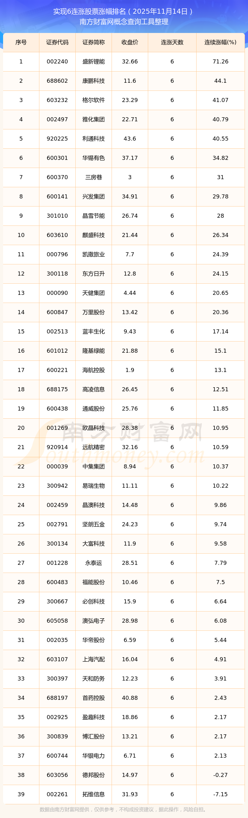 根據(jù)南方財富網(wǎng)概念查詢工具數(shù)據(jù)統(tǒng)計,截止2025年11月14日收盤,共有39只個股實現(xiàn)6天連漲。其中連續(xù)漲幅較大的個股有盛新鋰能、康鵬科技、格爾軟件等,連續(xù)漲幅分別為71.26%、44.10%、41.07%。