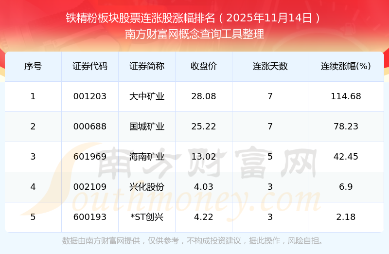 2025年11月14日鐵精粉板塊股票連漲股漲幅排名
