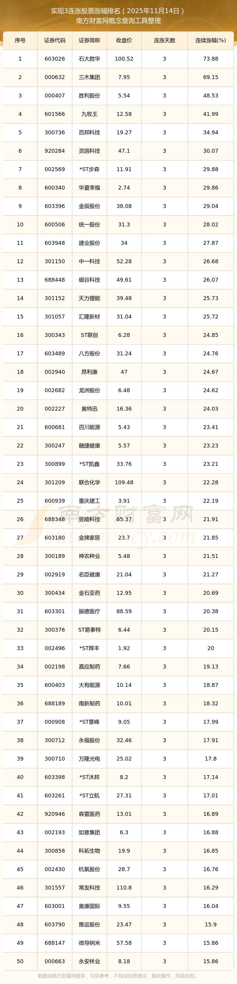2025年11月14日實(shí)現(xiàn)3連漲股票漲幅排名