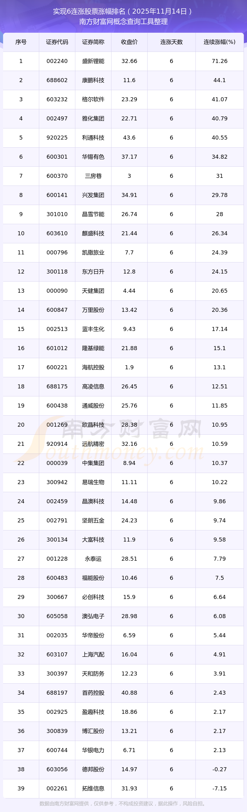 根據(jù)南方財(cái)富網(wǎng)概念查詢工具數(shù)據(jù)統(tǒng)計(jì),截止2025年11月14日收盤,共有39只個(gè)股實(shí)現(xiàn)6天連漲。其中連續(xù)漲幅較大的個(gè)股有盛新鋰能、康鵬科技、格爾軟件等,連續(xù)漲幅分別為71.26%、44.10%、41.07%。
