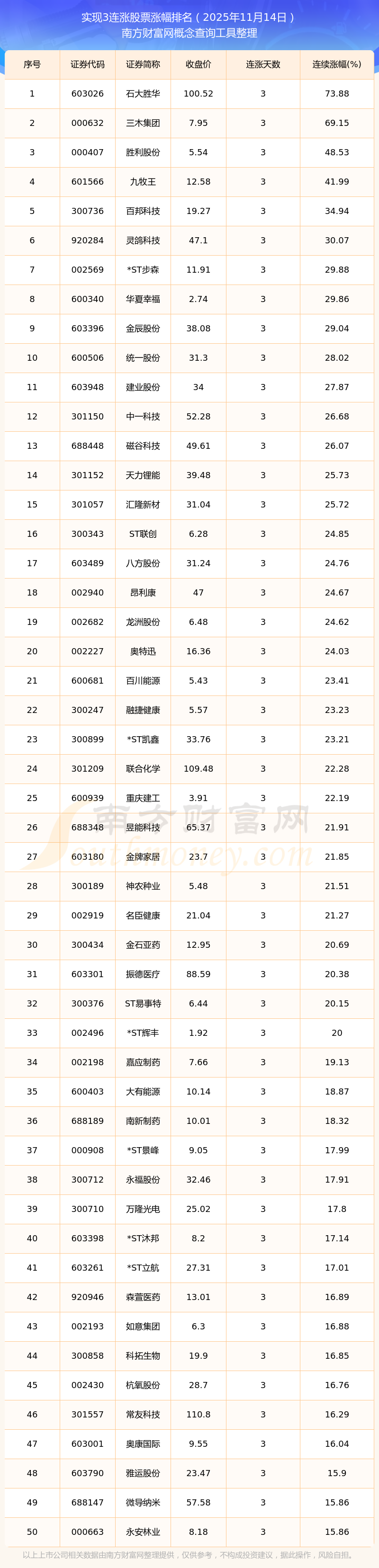 2025年11月14日實(shí)現(xiàn)3連漲股票漲幅排名