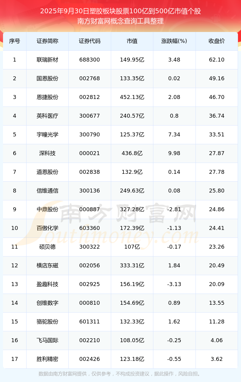 截止2025年9月30日,塑膠板塊股票市值100億到500億的個(gè)股共有17只。其中,市值較高的有恩捷股份、深科技、橫店東磁,市值分別為452.13億元、436.8億元、333.31億元。