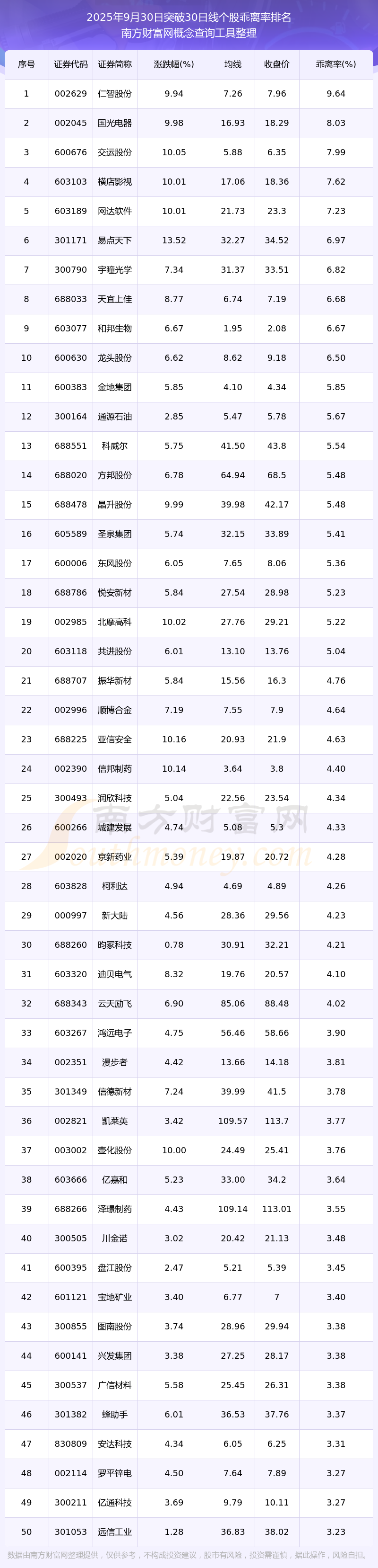 根據(jù)南方財(cái)富網(wǎng)概念查詢工具數(shù)據(jù)統(tǒng)計(jì),截止2025年9月30日收盤,共有317只個股收盤價向上突破了30日線,其中乖離率較大的個股有仁智股份、國光電器、交運(yùn)股份、橫店影視、網(wǎng)達(dá)軟件等,乖離率分別為9.64%、8.03%、7.99%、7.62%、7.23%。