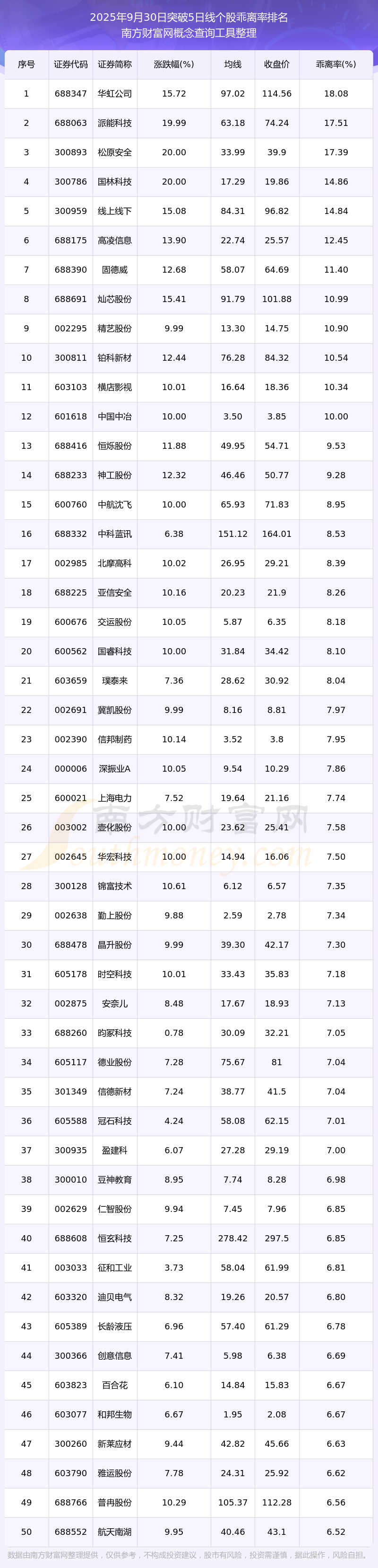 根據(jù)南方財富網(wǎng)概念查詢工具數(shù)據(jù)統(tǒng)計,截止2025年9月30日收盤,共有1271只個股收盤價向上突破了5日線,其中乖離率較大的個股有華虹公司、派能科技、松原安全、國林科技、線上線下等,乖離率分別為18.08%、17.51%、17.39%、14.86%、14.84%。