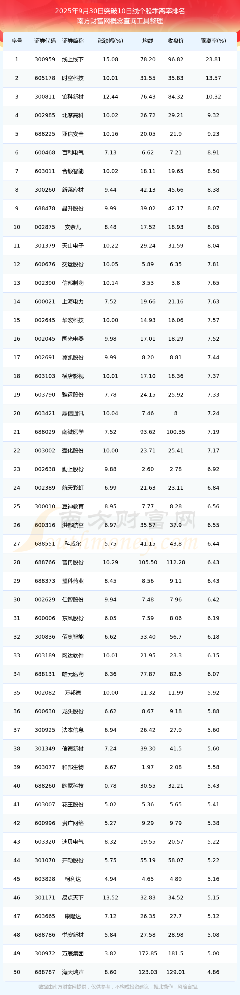 2025年9月30日突破10日線個(gè)股乖離率排名