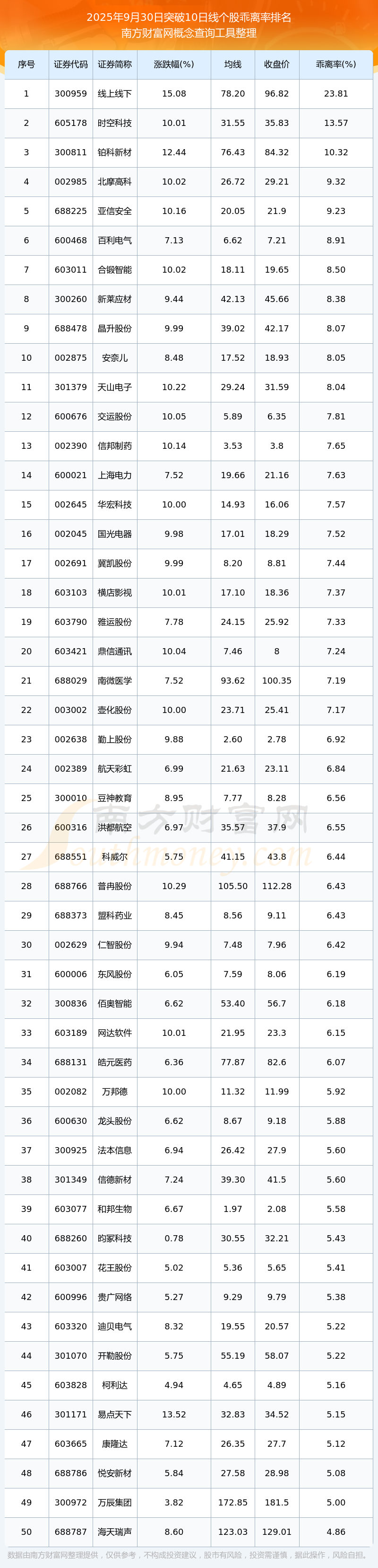 2025年9月30日突破10日線個(gè)股乖離率排名