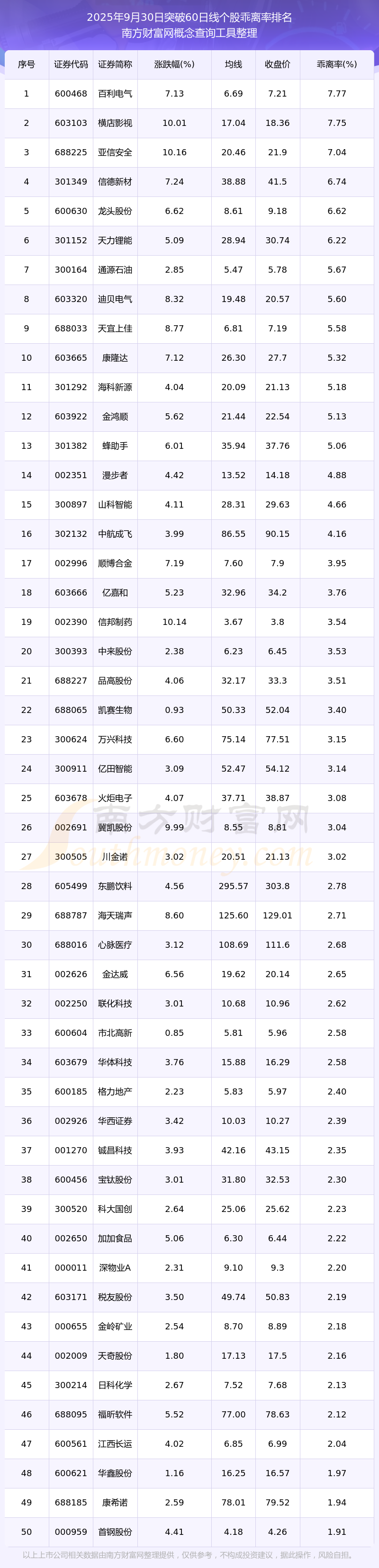 根據(jù)南方財富網(wǎng)概念查詢工具數(shù)據(jù)統(tǒng)計,截止2025年9月30日收盤,共有160只個股收盤價向上突破了60日線,其中乖離率較大的個股有百利電氣、橫店影視、亞信安全、信德新材、龍頭股份等,乖離率分別為7.77%、7.75%、7.04%、6.74%、6.62%。 2025年9月30日突破60日