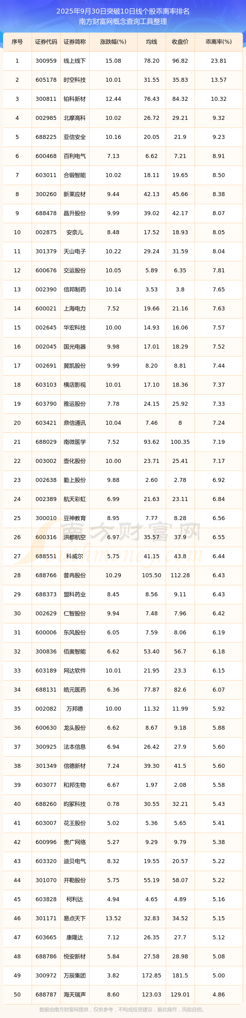 2025年9月30日突破10日線個(gè)股乖離率排名