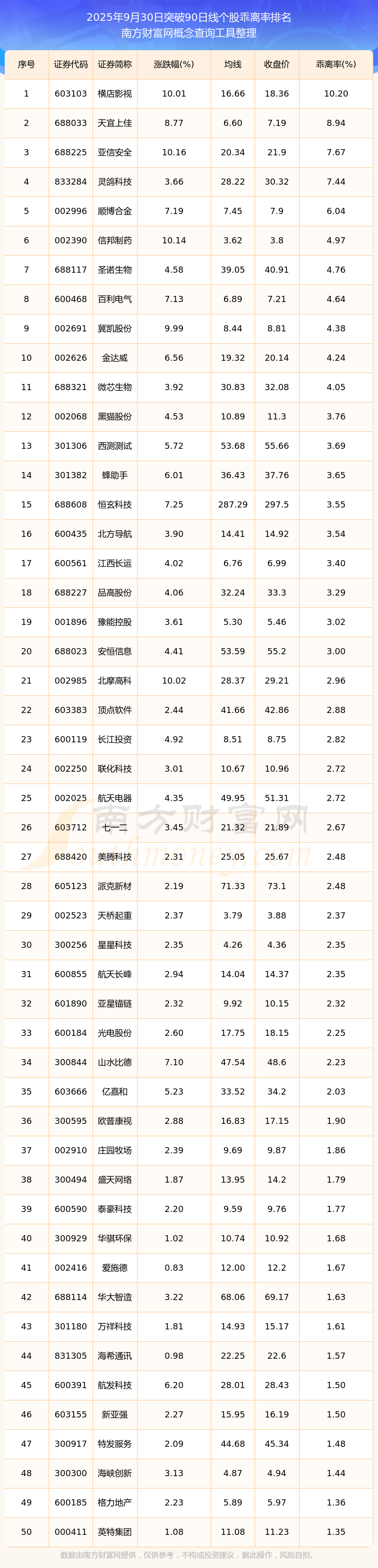 2025年9月30日突破90日線個(gè)股乖離率排名
