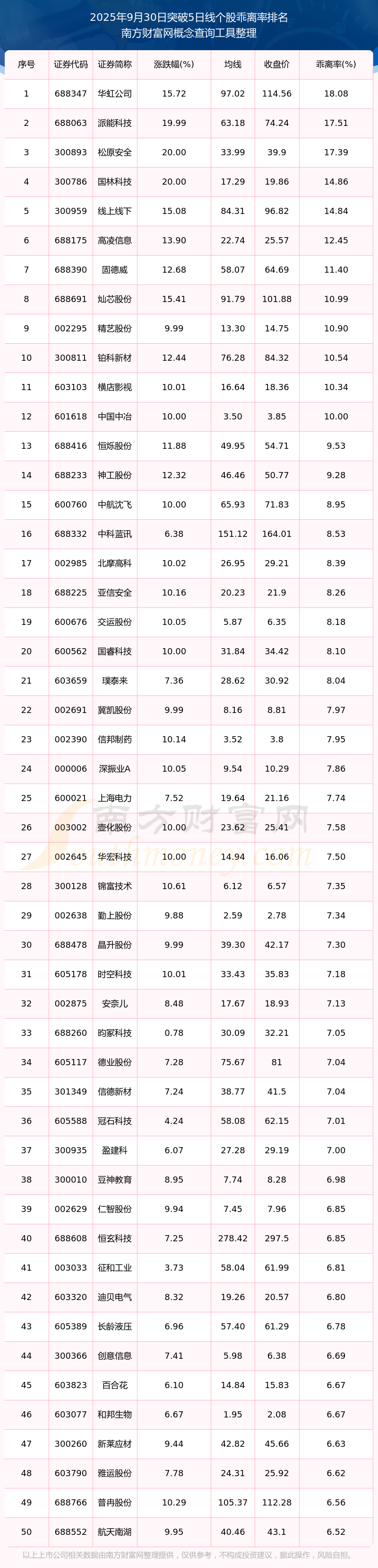 2025年9月30日突破5日線(xiàn)個(gè)股乖離率排名