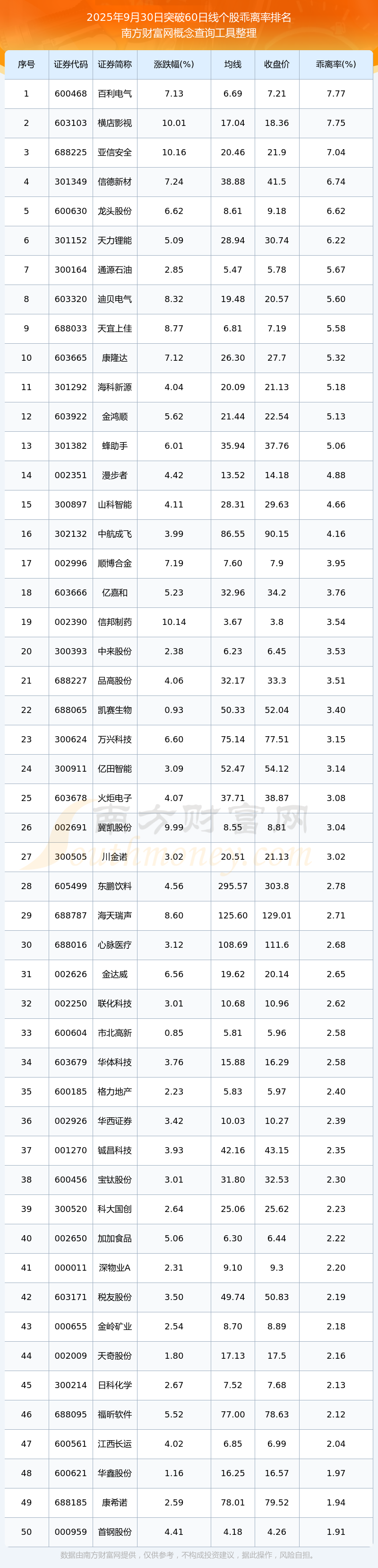 根據(jù)南方財富網(wǎng)概念查詢工具數(shù)據(jù)統(tǒng)計,截止2025年9月30日收盤,共有160只個股收盤價向上突破了60日線,其中乖離率較大的個股有百利電氣、橫店影視、亞信安全、信德新材、龍頭股份等,乖離率分別為7.77%、7.75%、7.04%、6.74%、6.62%。