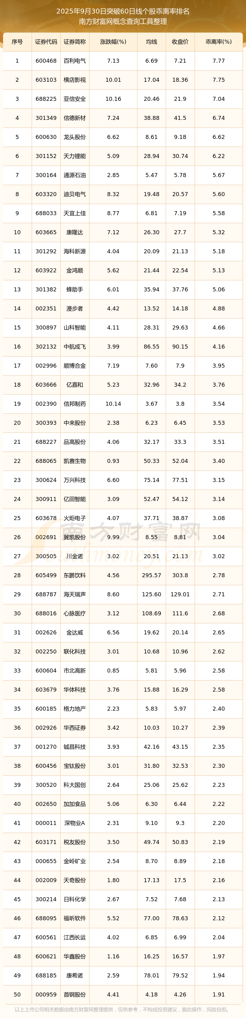 2025年9月30日突破60日線(xiàn)個(gè)股乖離率排名