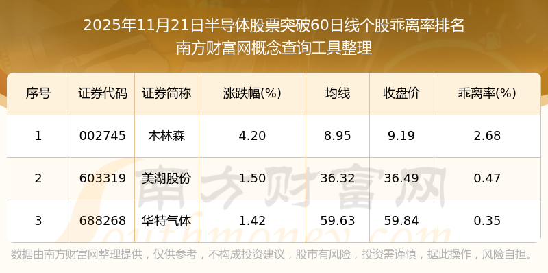 根據(jù)南方財(cái)富網(wǎng)概念查詢工具數(shù)據(jù)統(tǒng)計(jì),截止2025年11月21日收盤,半導(dǎo)體股票共有3只個(gè)股收盤價(jià)向上突破了60日線。其中乖離率較大的個(gè)股有木林森、美湖股份、華特氣體等,乖離率分別為2.68%、0.47%、0.35%。
