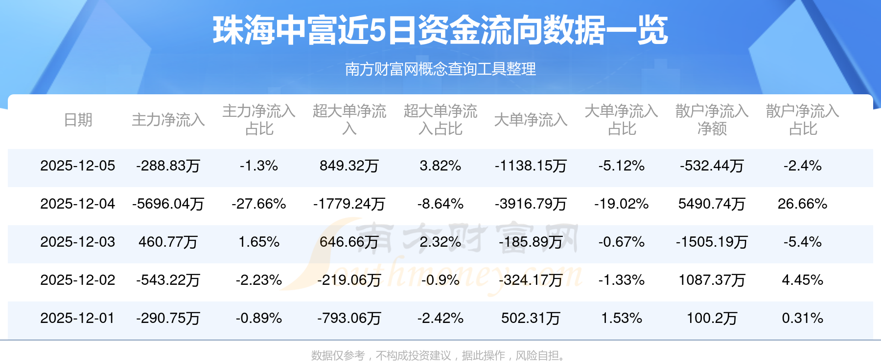 12月5日消息,珠海中富主力凈流出288.83萬(wàn)元,超大單凈流入849.32萬(wàn)元,散戶凈流出532.44萬(wàn)元。