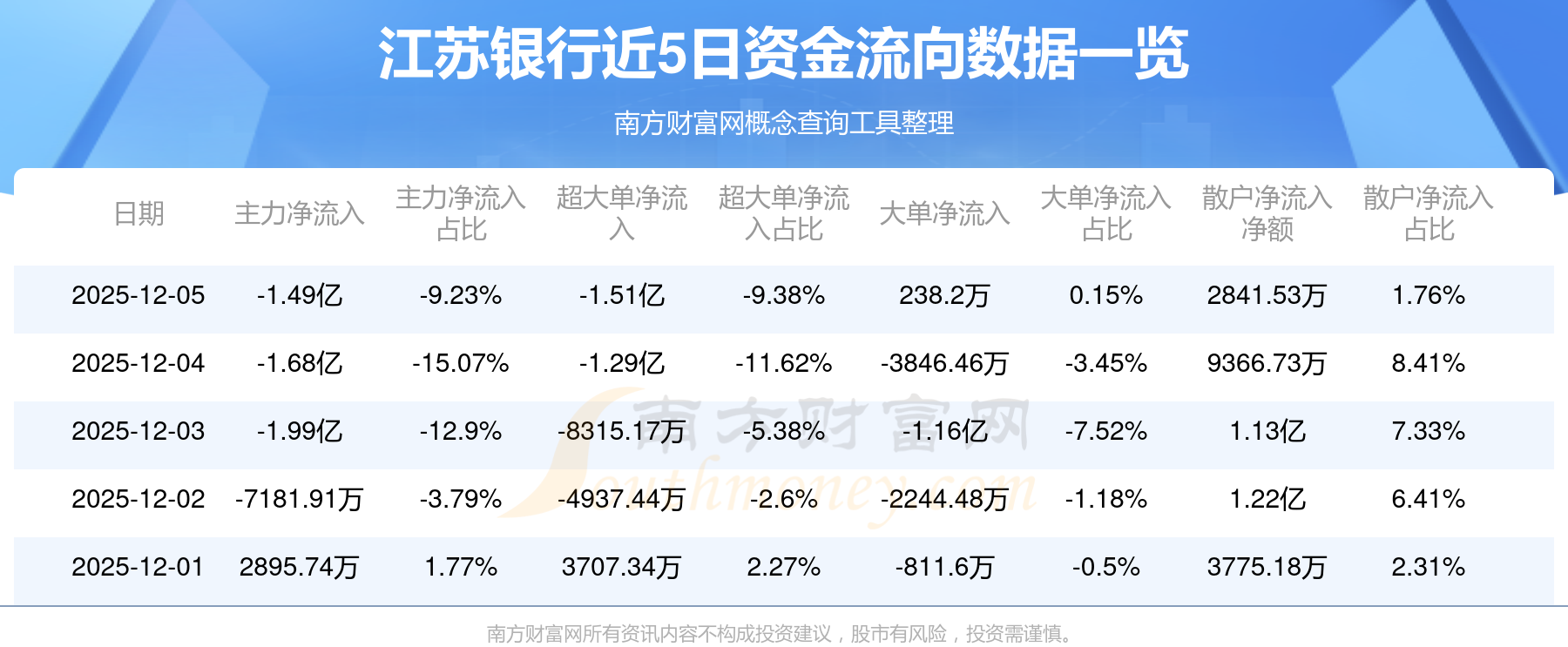 12月5日消息,江蘇銀行主力凈流出1.49億元,超大單凈流出1.51億元,散戶凈流入2841.53萬元。