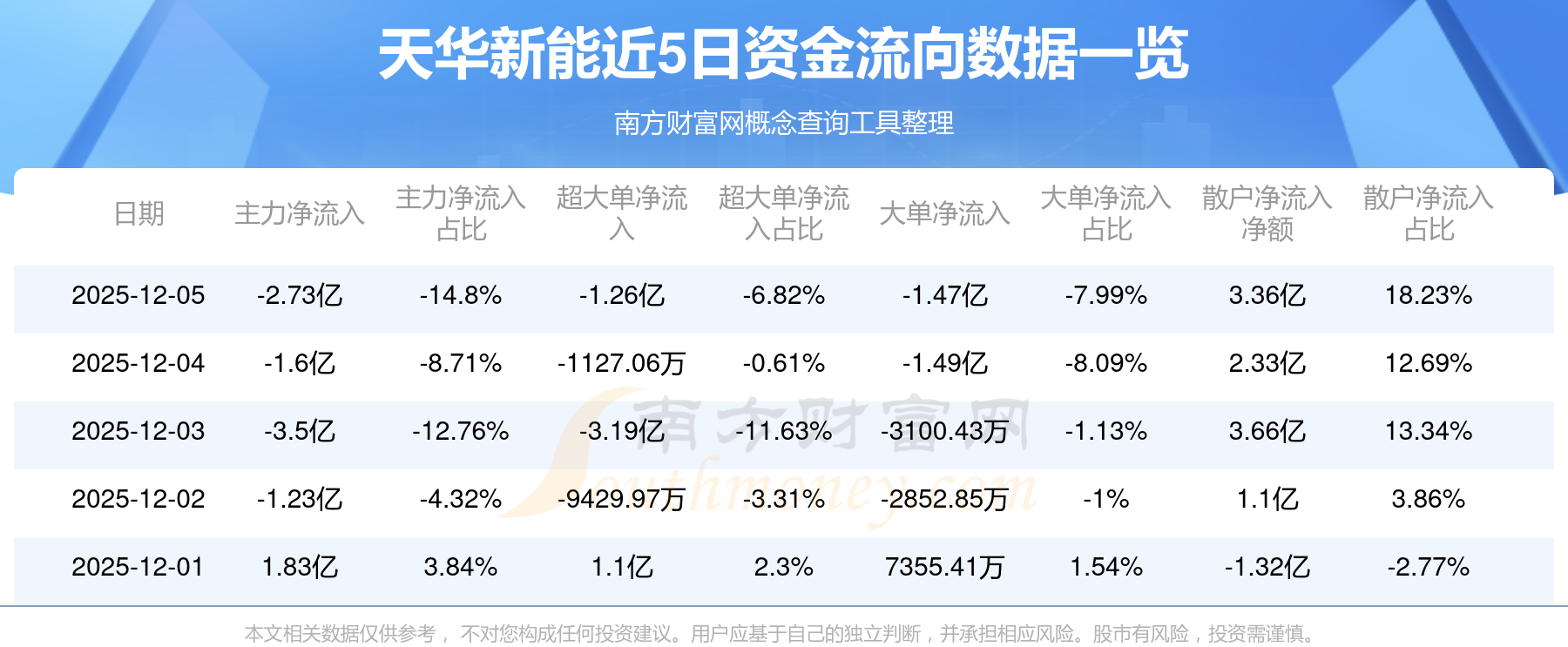 12月5日消息,天華新能12月5日主力資金凈流出2.73億元,超大單資金凈流出1.26億元,大單資金凈流出1.47億元,散戶資金凈流入3.36億元。