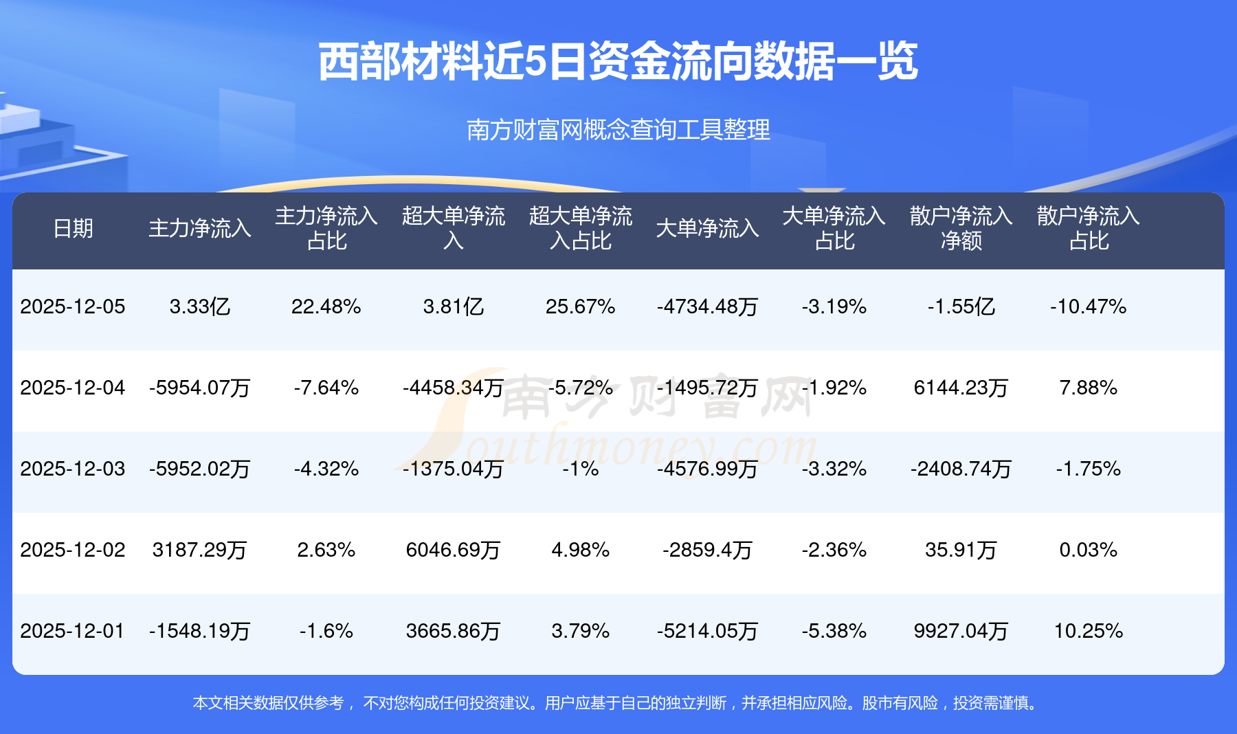 12月5日消息,西部材料資金凈流入3.33億元,超大單資金凈流入3.81億元,換手率15.32%,成交金額14.83億元。