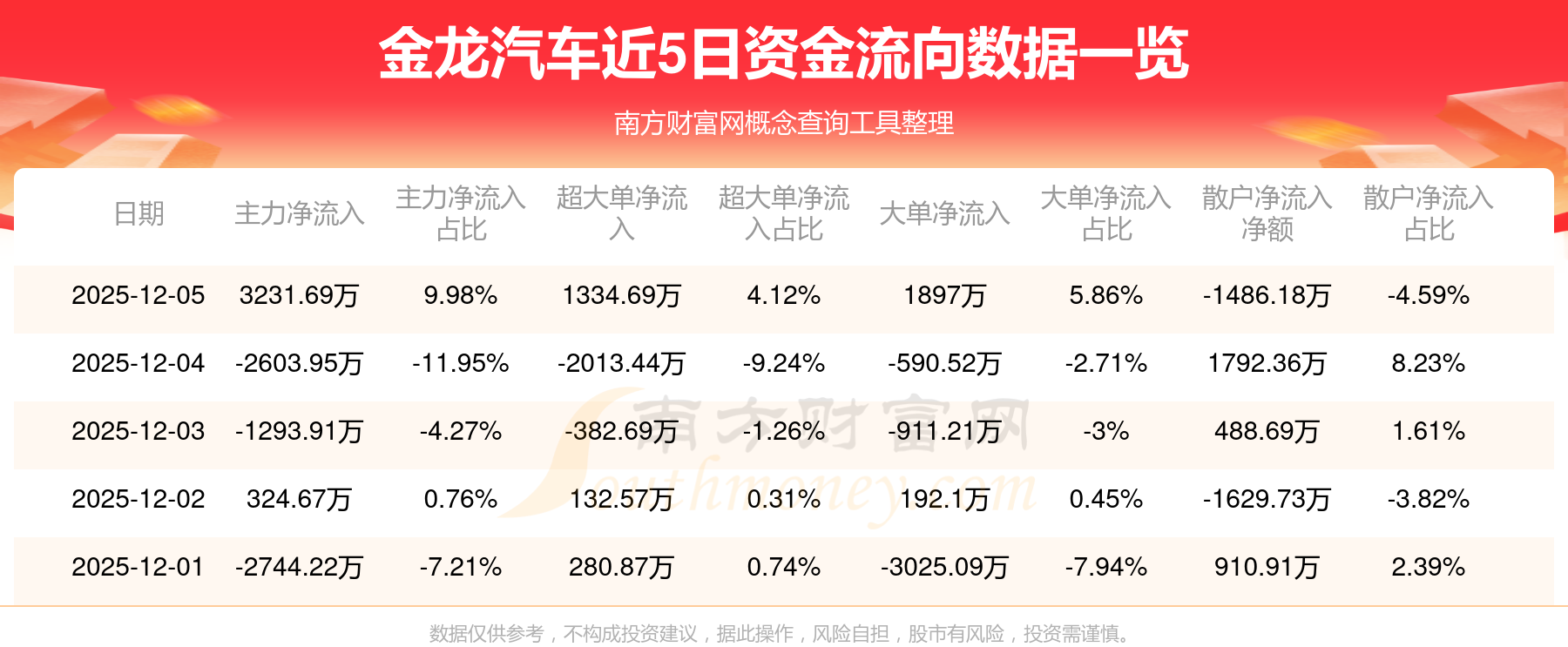 12月5日消息,金龍汽車資金凈流入3231.69萬元,超大單資金凈流入1334.69萬元,換手率2.76%,成交金額3.24億元。
