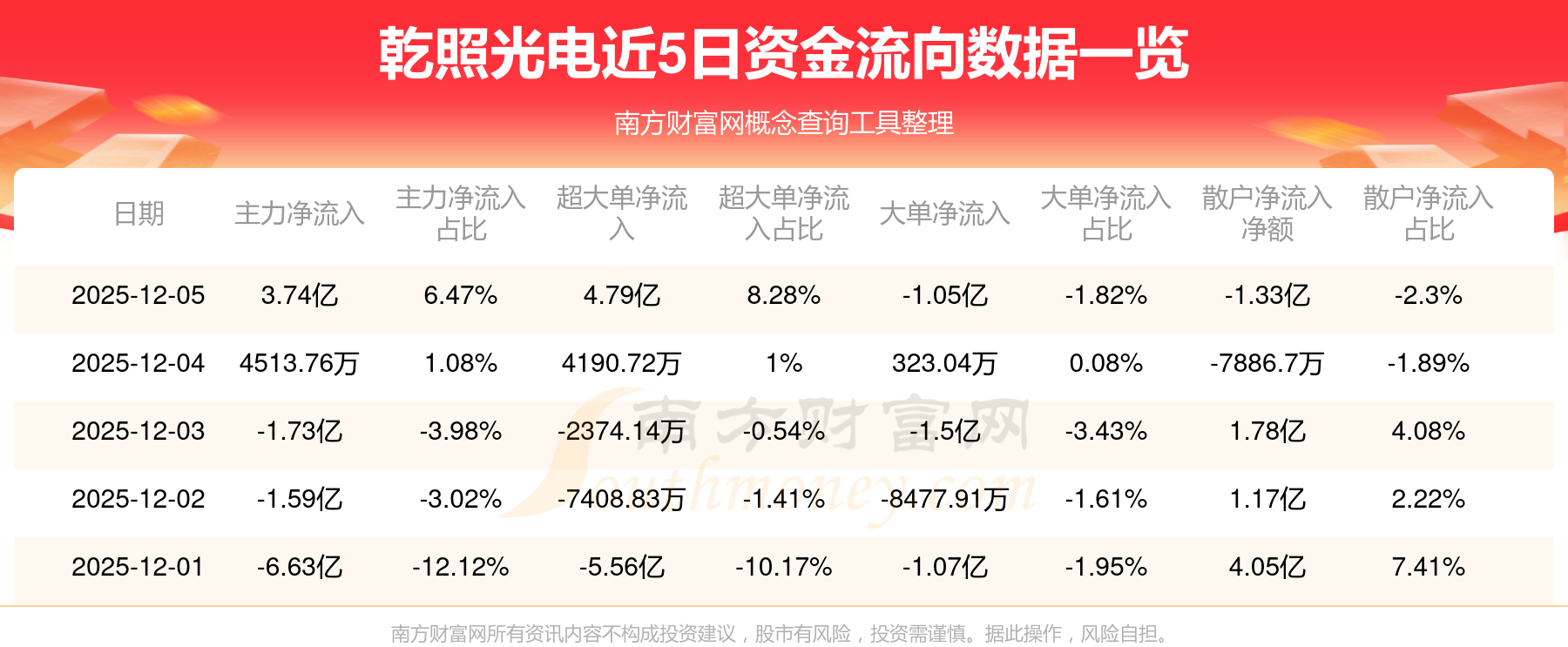 12月5日消息,乾照光電資金凈流入3.74億元,超大單資金凈流入4.79億元,換手率27.61%,成交金額57.82億元。