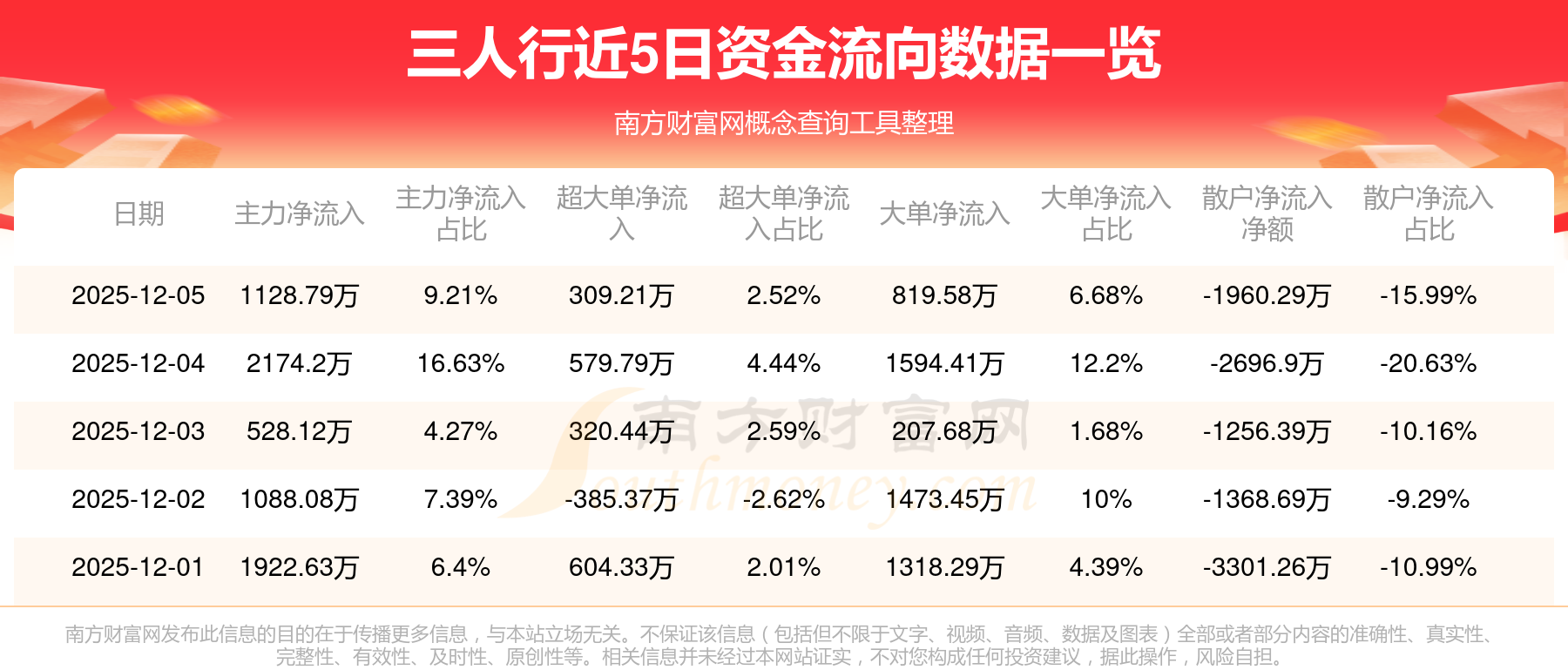 12月5日消息,三人行主力資金凈流入1128.79萬(wàn)元,超大單資金凈流入309.21萬(wàn)元,散戶資金凈流出1960.29萬(wàn)元。