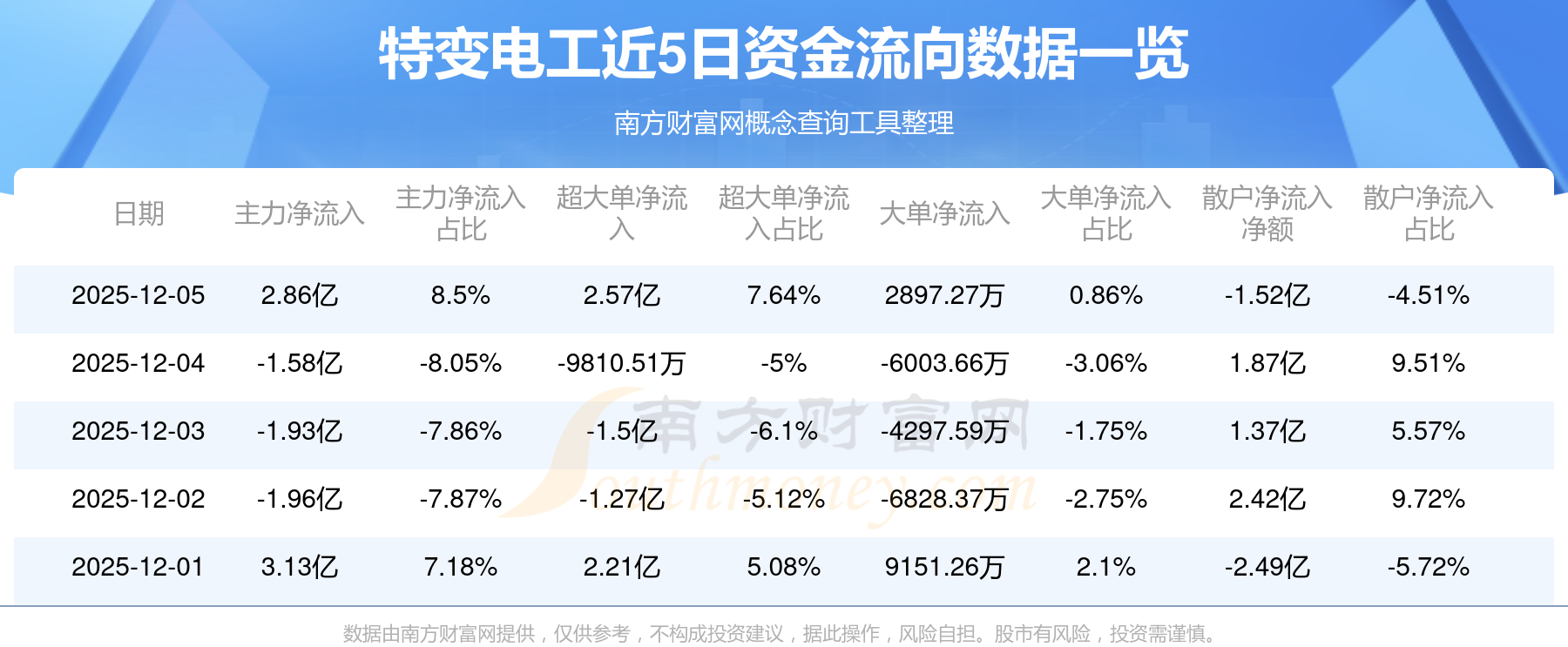12月5日消息,特變電工資金凈流入2.86億元,超大單資金凈流入2.57億元,換手率3.05%,成交金額33.66億元。