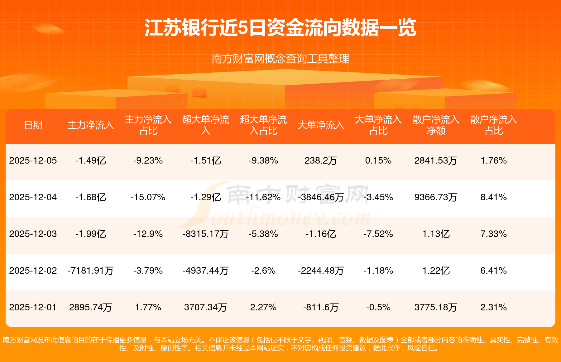 12月5日消息,江蘇銀行主力資金凈流出1.49億元,超大單資金凈流出1.51億元,散戶資金凈流入2841.53萬元。