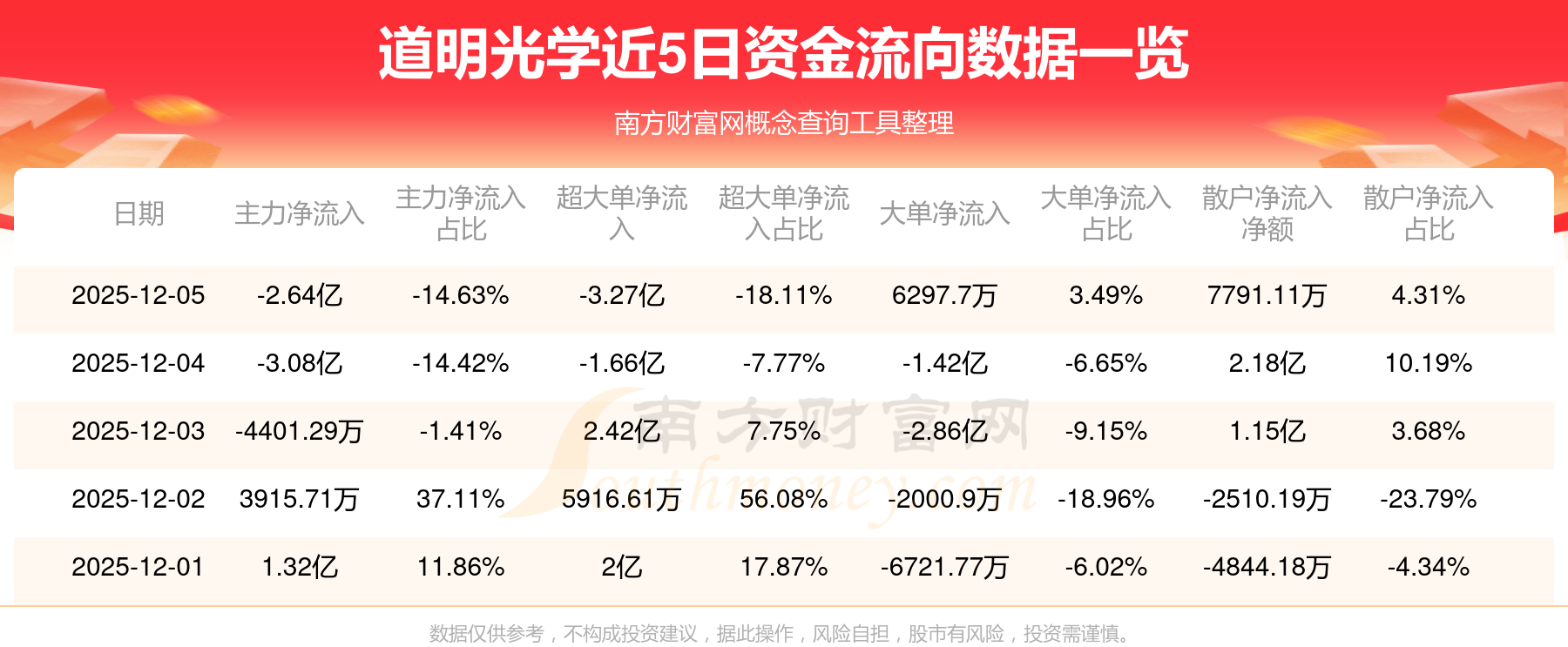 12月5日消息,道明光學主力資金凈流出2.64億元,超大單資金凈流出3.27億元,散戶資金凈流入7791.11萬元。
