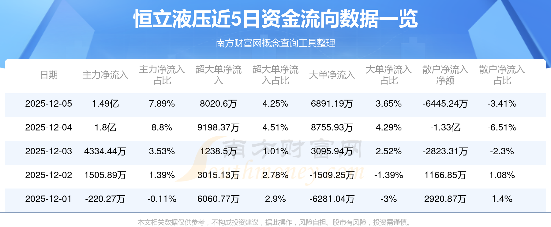 12月5日消息,恒立液壓主力凈流入1.49億元,超大單凈流入8020.6萬(wàn)元,散戶凈流出6445.24萬(wàn)元。