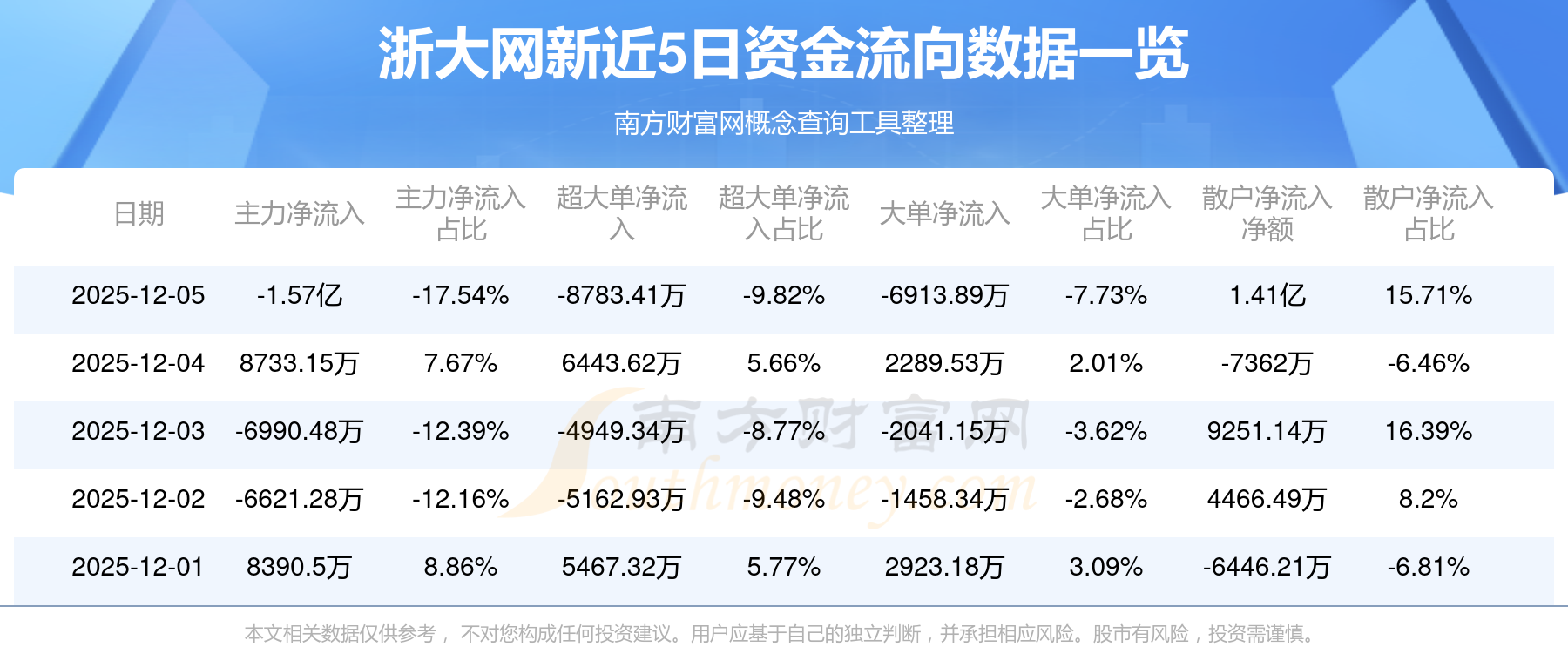 資金流向數(shù)據(jù)方面,12月5日主力資金凈流流出1.57億元,超大單資金凈流出8783.41萬元,大單資金凈流出6913.89萬元,散戶資金凈流入1.41億元。